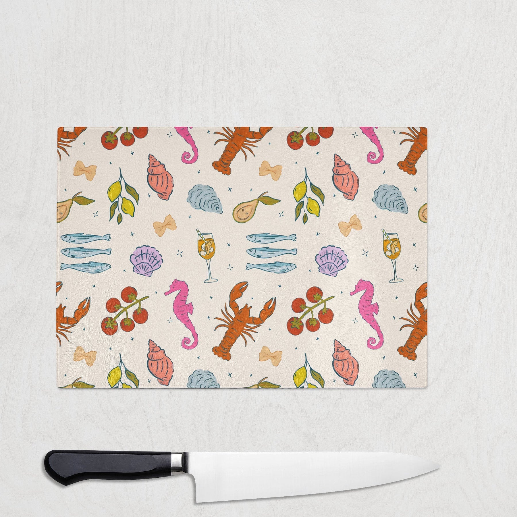 This colourful chopping board is splashed with a joyful repeat print of lobsters, lemons, pasta, seahorses, Aperol spritz glasses, and other dreamy holiday bits.