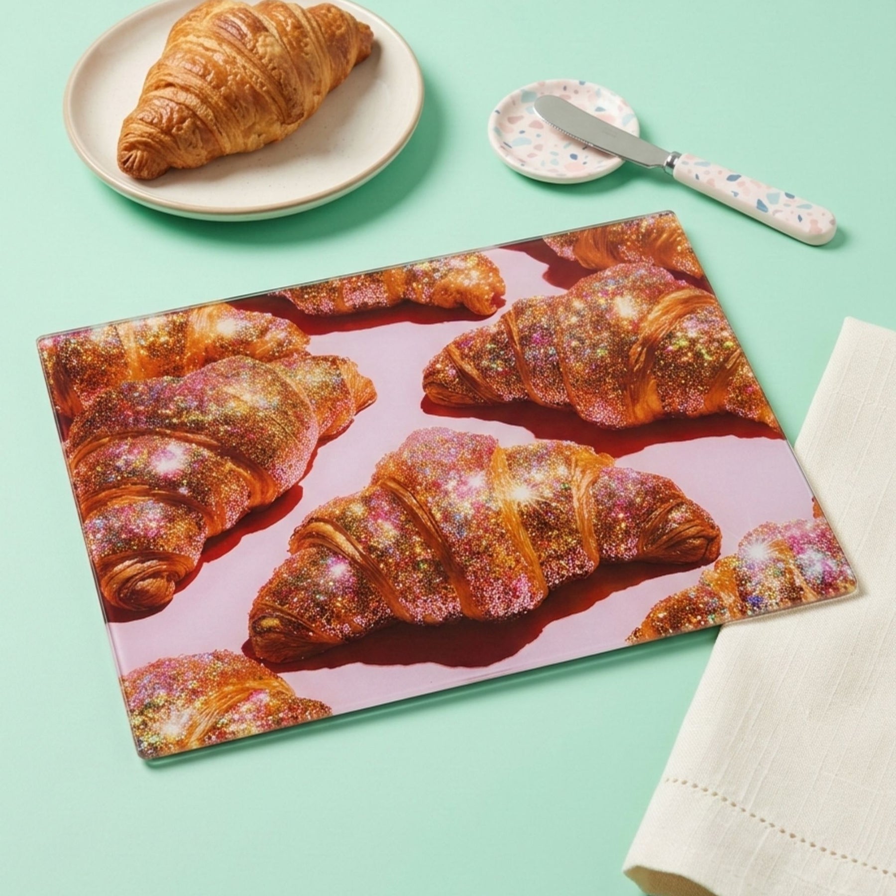 Make breakfast sparkle with the Glitter Croissant Glass Chopping Board! A sea of buttery croissants covered in rainbow glitter, set against a bright pink backdrop – perfect for serving up some serious brunch envy.