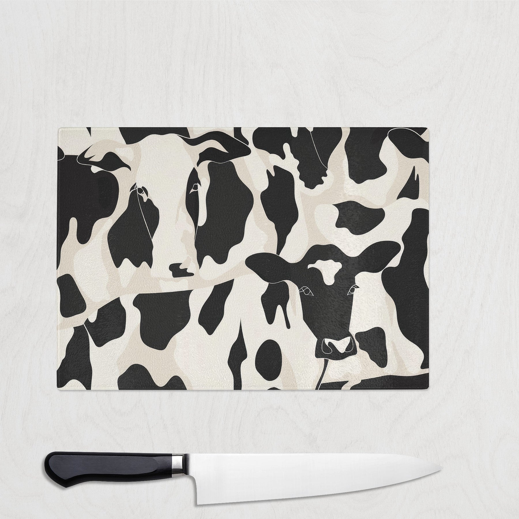 Our Monochrome Moo glass chopping board brings high-contrast cow print to your countertop — with hidden faces peeking through the pattern for added charm.
