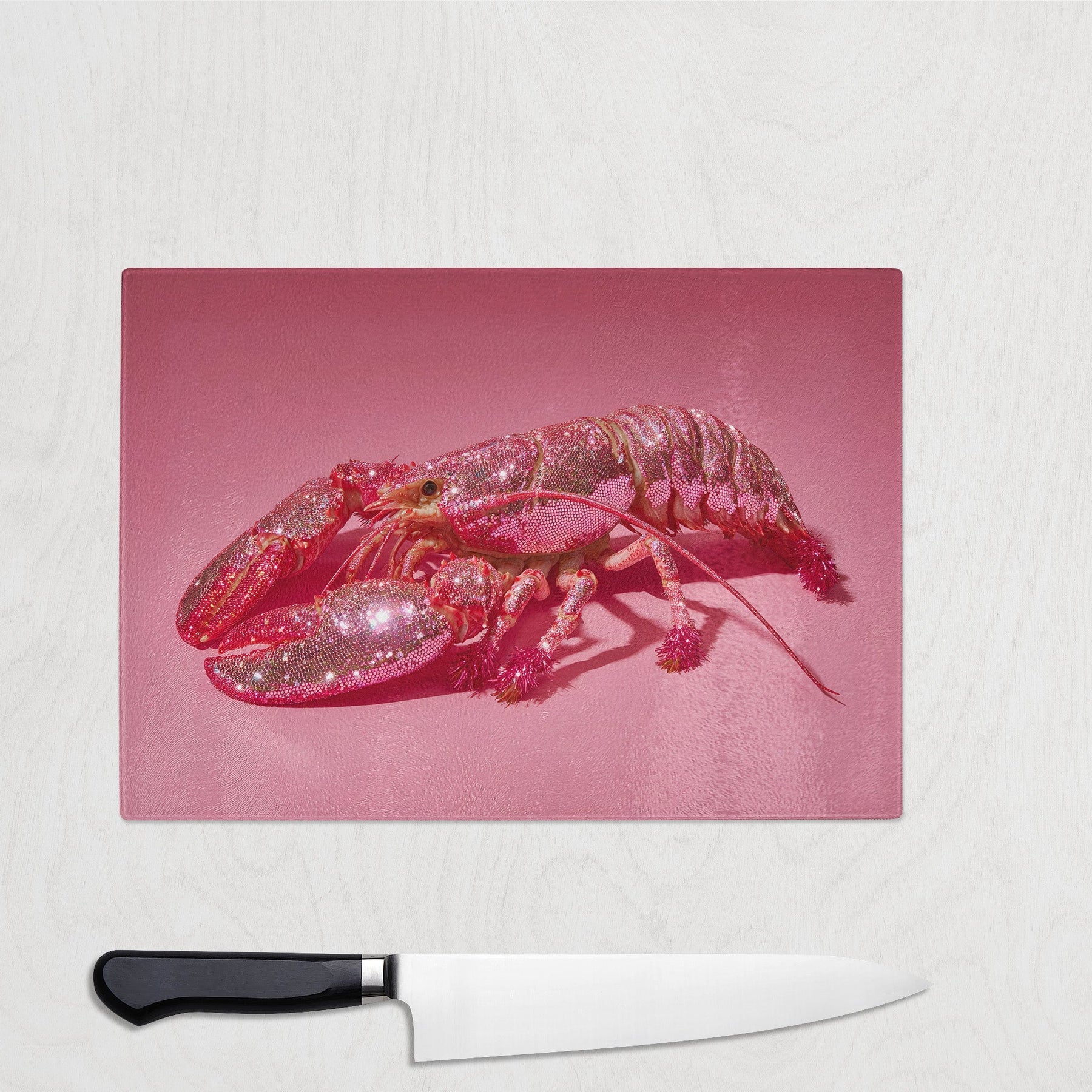 Pink glitter lobster on a bright pink background printed on a glass chopping board – bold, quirky, and fun kitchen decor.