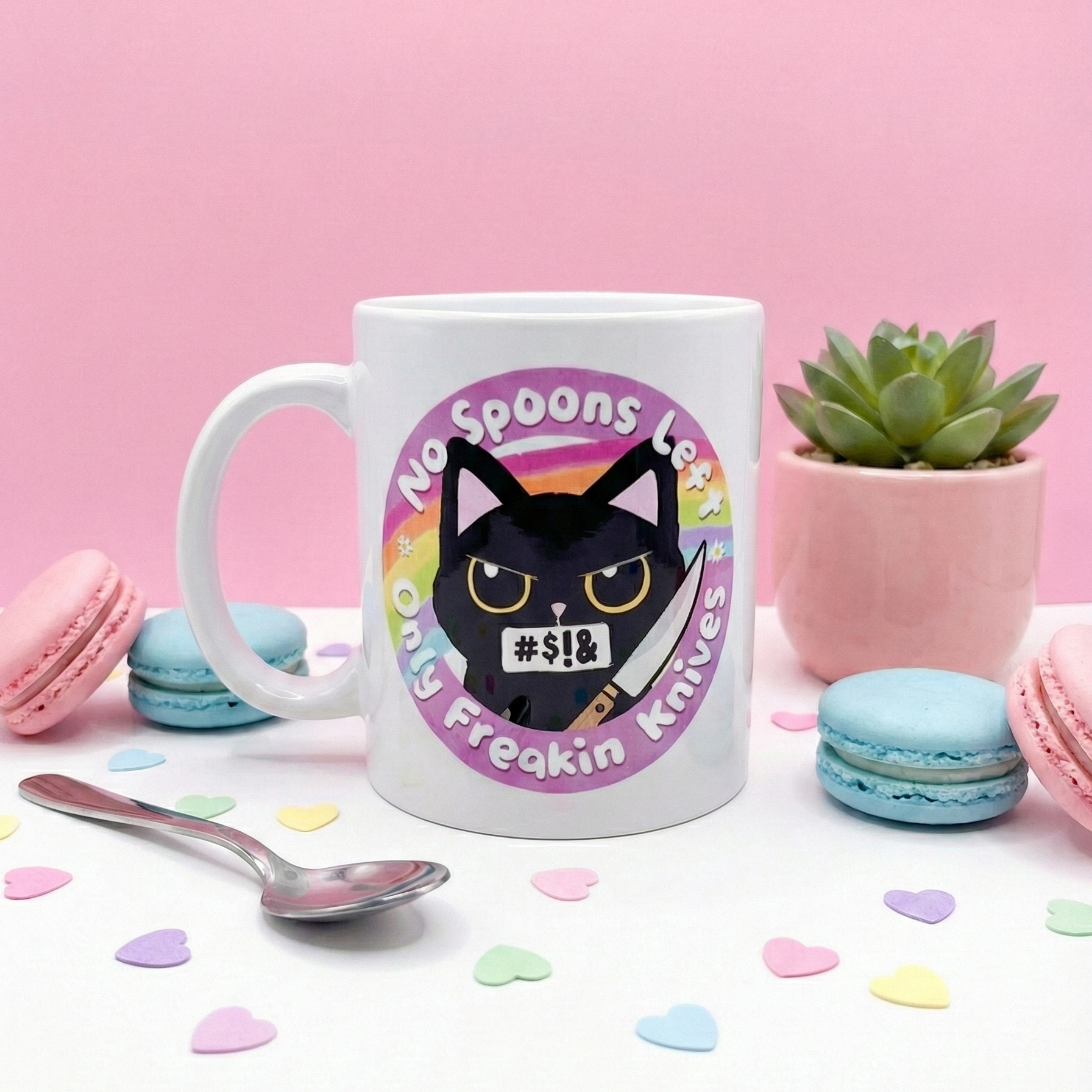 No spoons left only knives funny cat mug. It's a colourful fun statement mug.