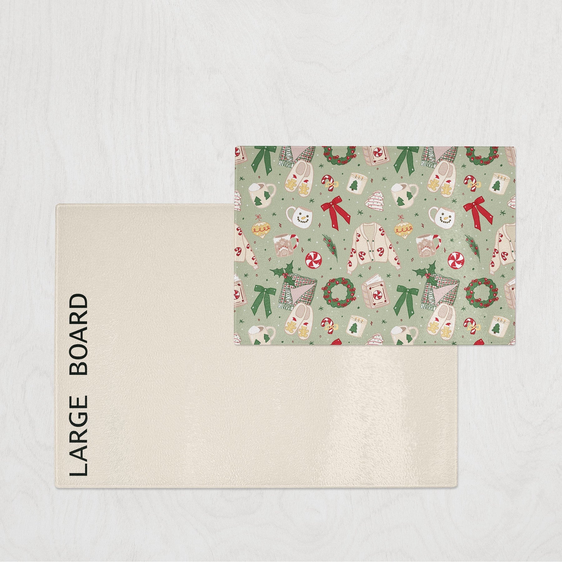Covered in cute winter jumpers, hot chocolate mugs, wreaths, slippers, bows, and sweet little treats, this glass chopping board is the perfect mix of nostalgic and playful.