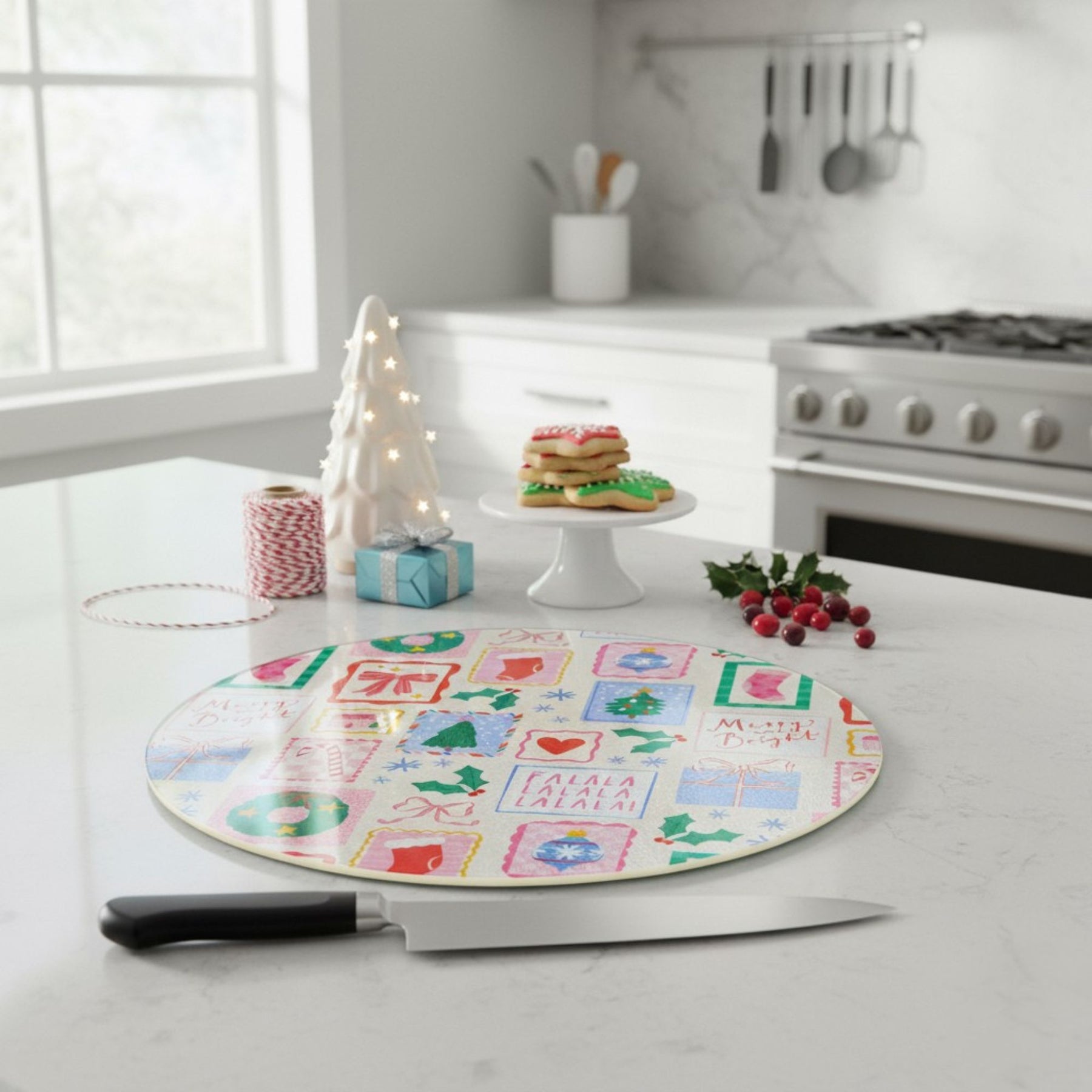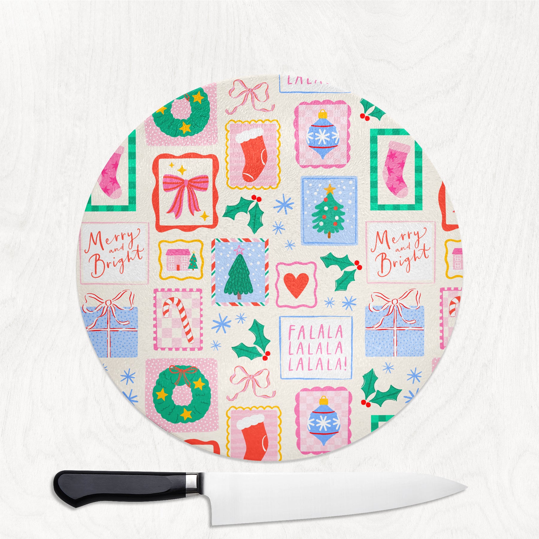 Add instant cheer to your kitchen with this colourful round chopping board featuring a joyful grid of presents, holly, and festive icons.