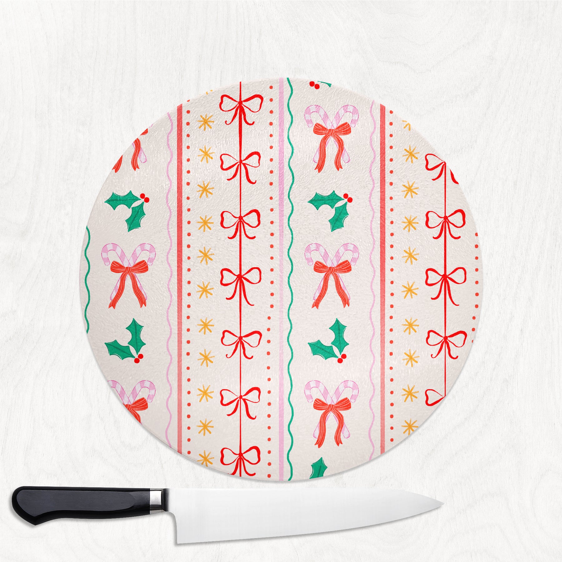 This 30cm round chopping board brings all the Christmas classics — bows, candy canes, and holly — in a cheerful striped layout.