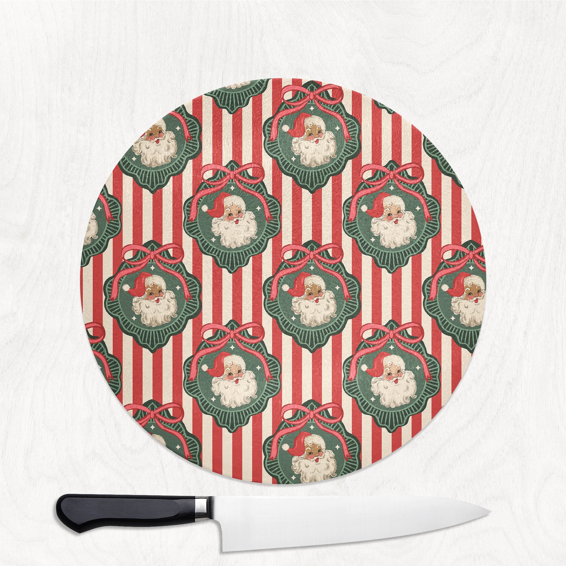 This round glass board features candy cane stripes with vintage-style Santa cameos in scalloped green frames.