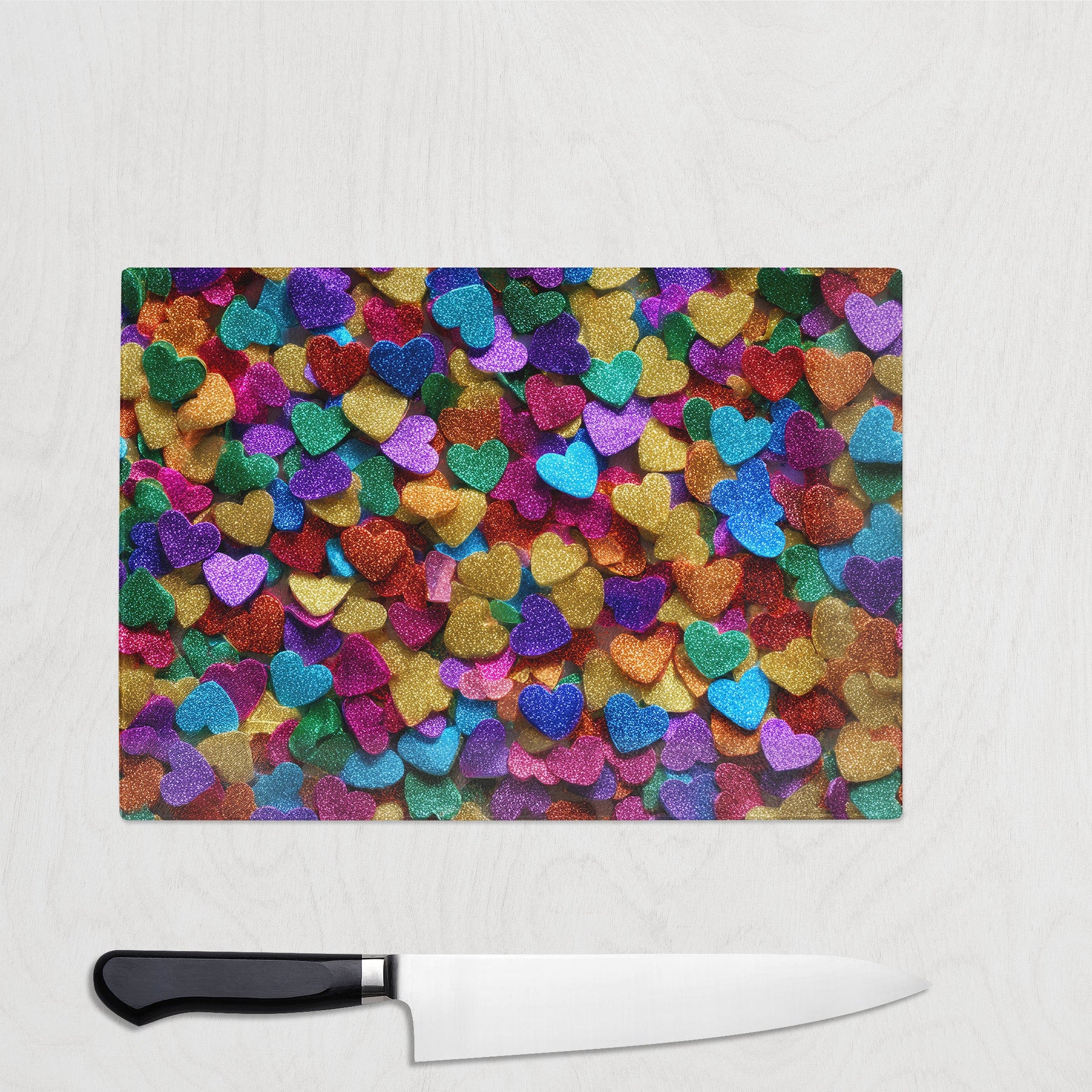 Confetti Hearts glass chopping board with colourful heart confetti design