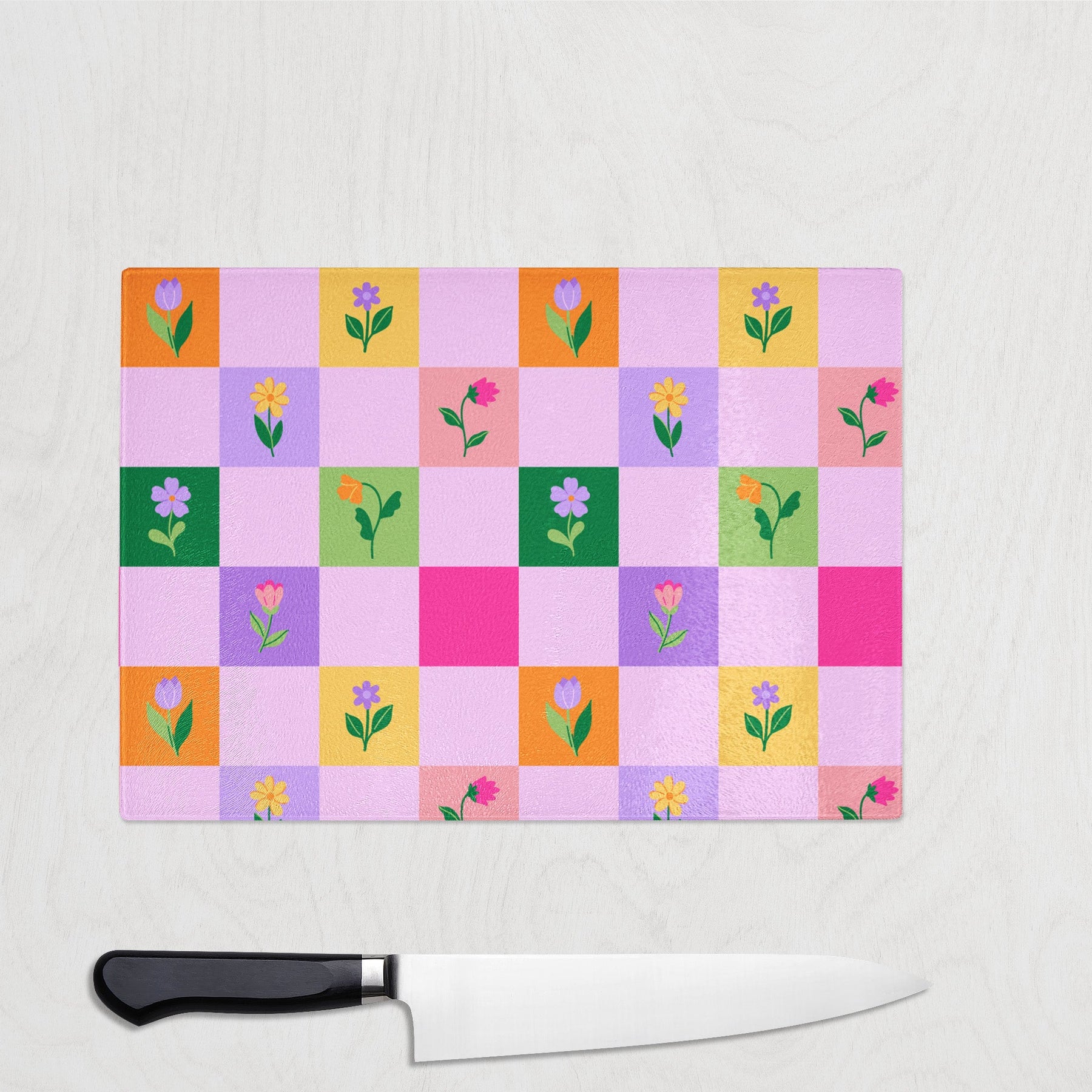 This bright and cheerful chopping board features a playful checkerboard design in pink, orange, lilac and green, with each square housing a sweet flower illustration.