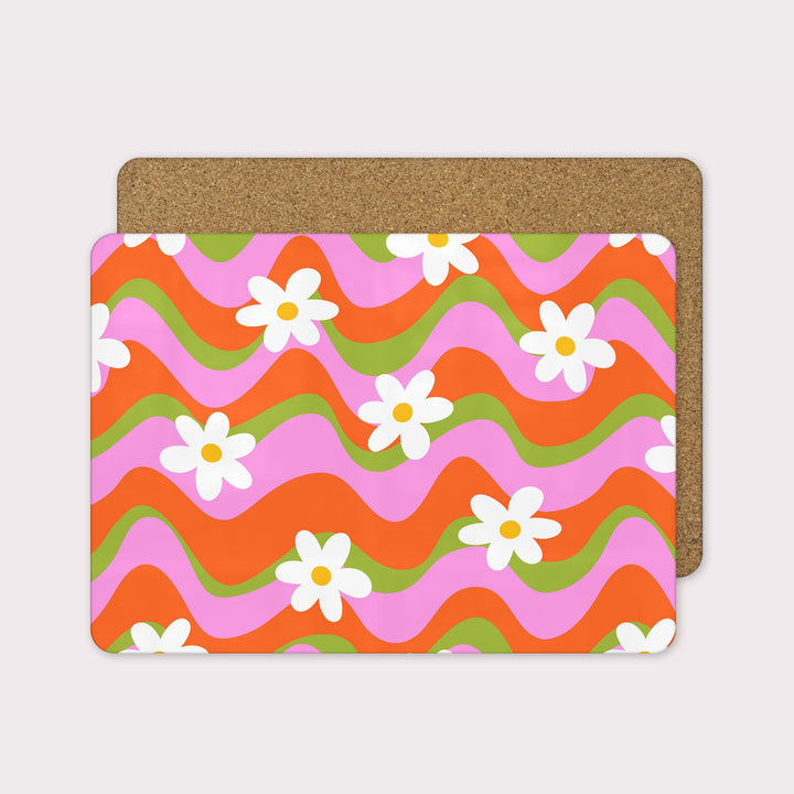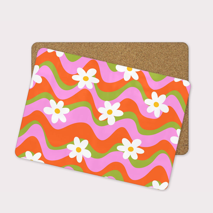 Bring the fun to your table with the Colourful Wave placemat! Featuring bold retro-inspired waves in juicy orange, pink and green, scattered with sweet white daisies, this design is pure joy.
