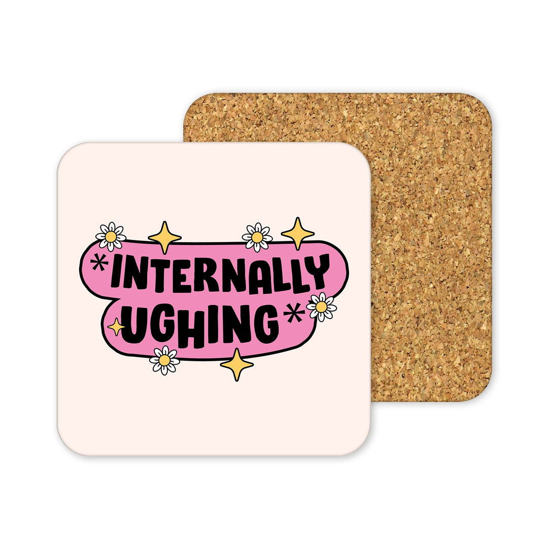 The Yililo Internally Urging Cork Back Coaster has a square shape with a pink and white top, bold black letters spelling INTERNALLY UGHING, and playful accents of white daisies and yellow sparkles.