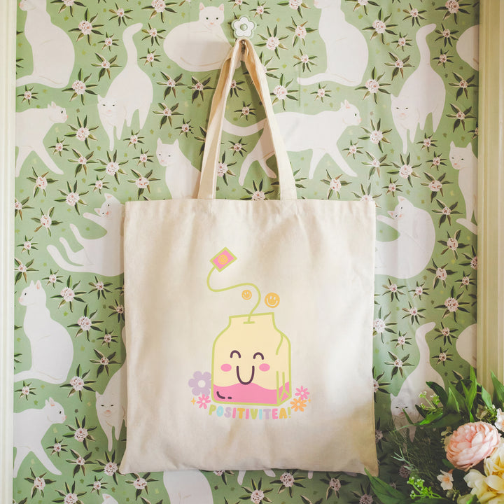 The Yililo Positivitea Tote Bag in beige hangs on a wall, showcasing a smiling teapot with flowers and colorful Positivitea text—an ideal cheerful accessory for optimistic tea lovers.