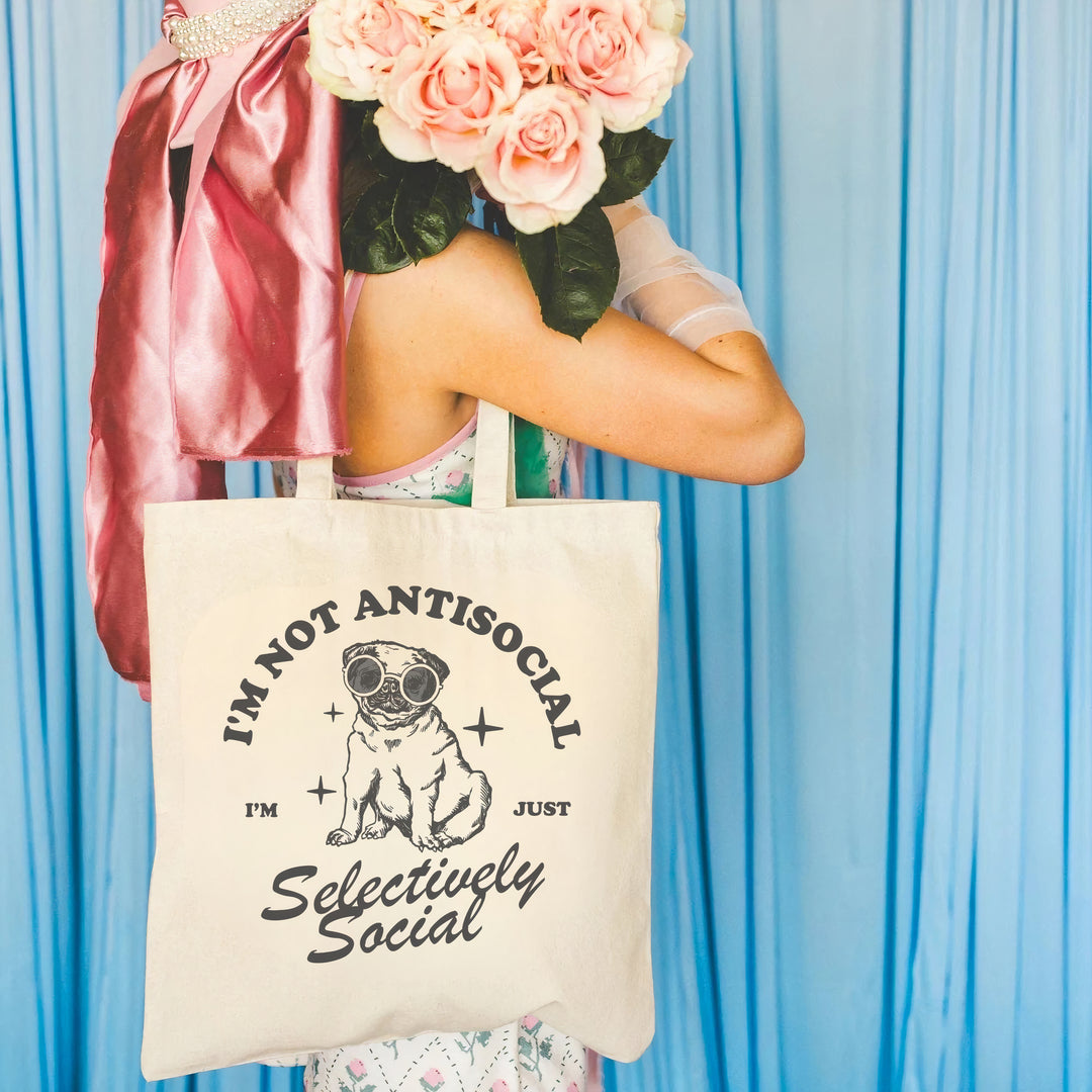 The Yililo Selectively Social Tote Bag features a pug in sunglasses with IM NOT ANTISOCIAL. above and IM JUST Selectively Social. below—perfect for introverts and dog lovers. The beige bag hangs on a neutral wall.