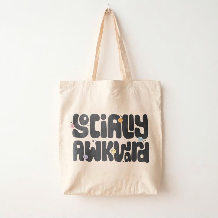 The Yililo Socially Awkward Tote Bag in beige hangs on the wall, showcasing bold black letters and colorful smiley faces—a fun, relatable accessory and perfect gift for introverts.