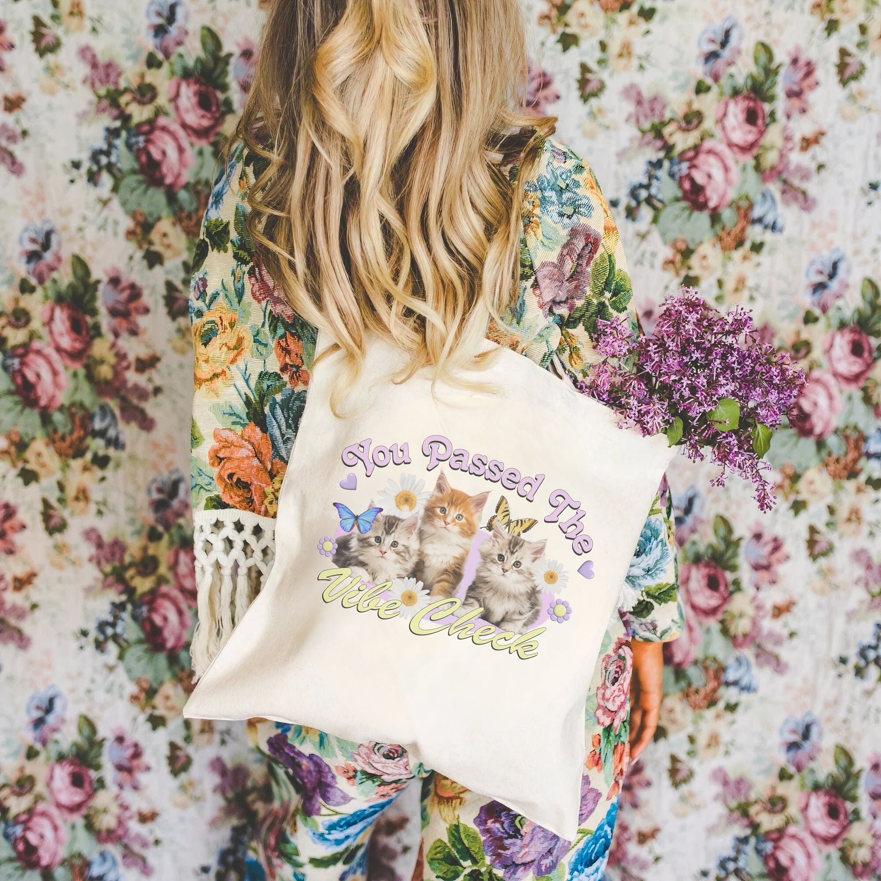 The Yililo You Passed the Vibe Check Tote Bag is a beige accessory for cat lovers, with three kittens, flowers, a butterfly, and pastel text. Perfect for adding cottagecore charm!.